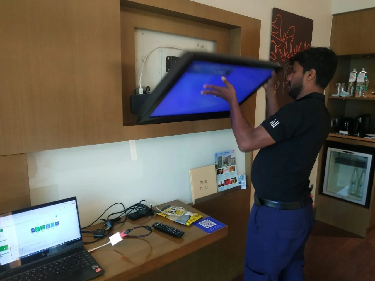 Unfortunately, the hotel TV is mounted into the wall in the room which made it difficult for me to get to the HDMI socket. I called for technical assistance who in turn called onsite engineering services to help me.