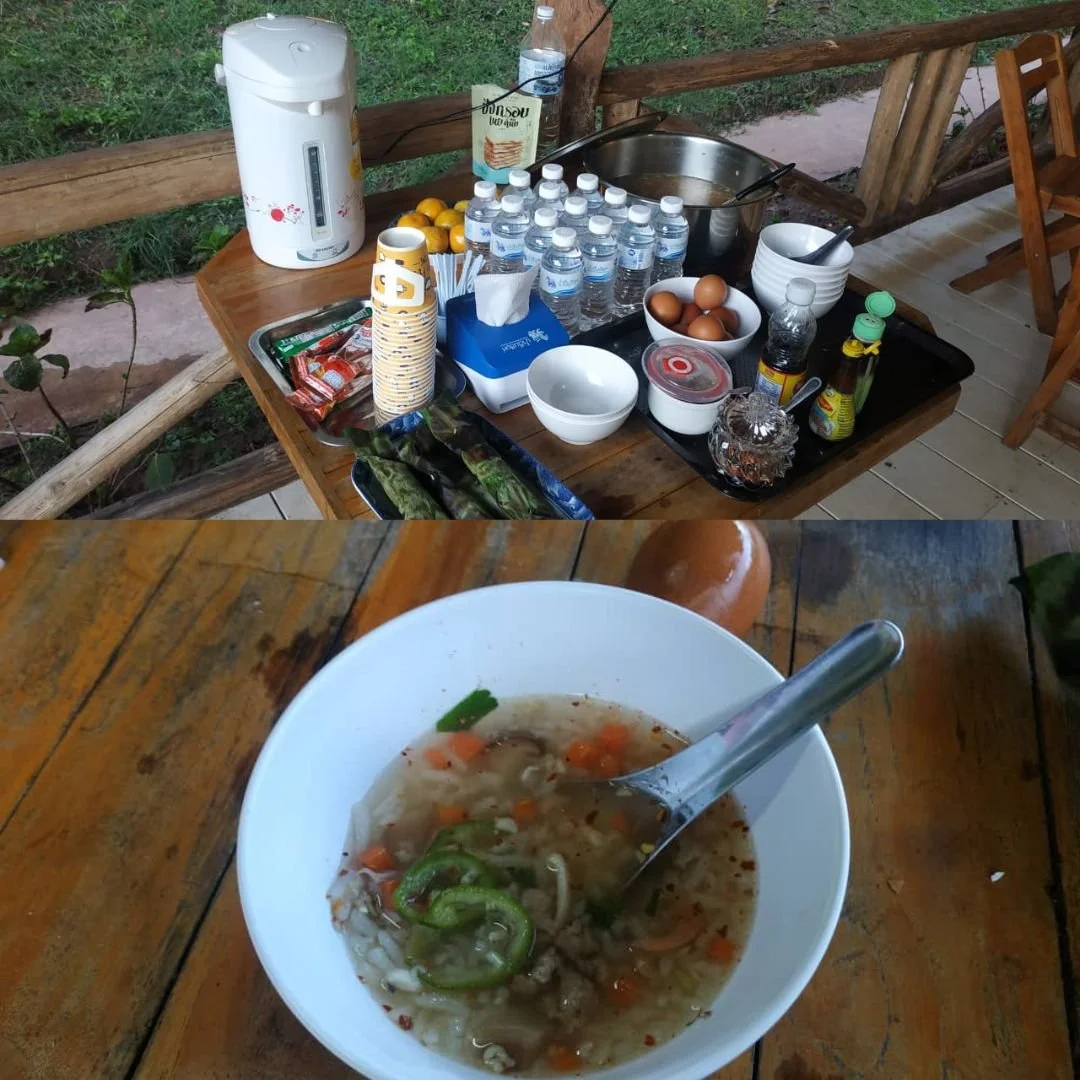 Top - breakfast table laid - a typical rural Thai breakfast spread - a fruit, rice soup with sauces (and chilli flakes), a sweet (sticky rice in banana leaf), half boiled eggs with instant coffee or chocolate, bottom - my bowl of rice soup with half boiled egg!