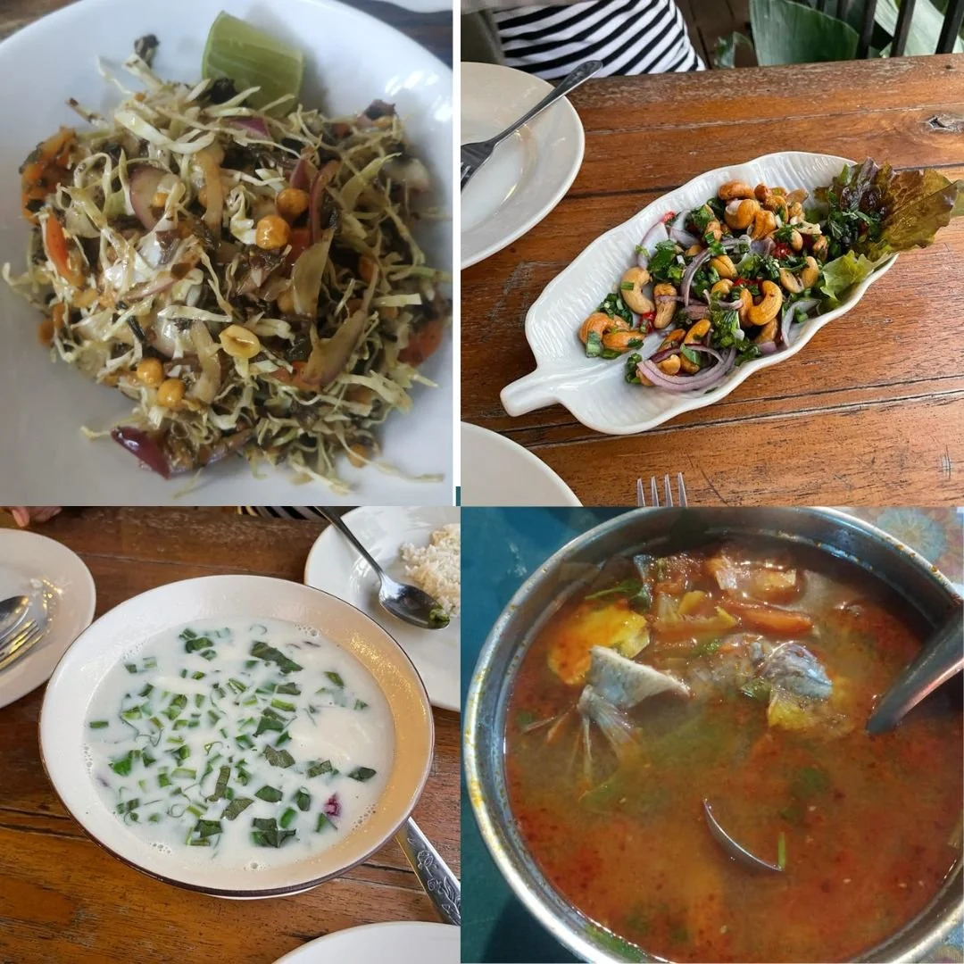 The FOOD!! - top left - green tea leaf salad (just awesome and first time for me), top right - cashew nut salad (another first) popular in northern Thailand, bottom left - Tom yum from western Thailand (Mae Sariang), bottom right - tom yum from eastern Thailand (Phatang camp). ALL so good yet so different.