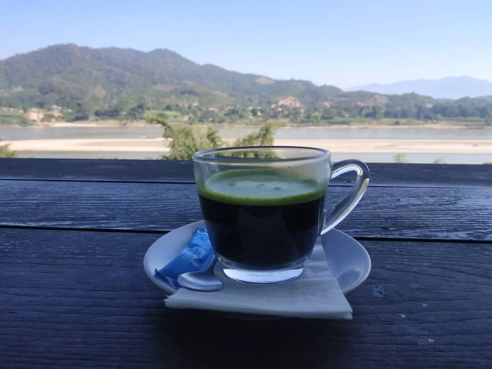 Green tea with a view at Panorama Coffee - Laos and the Mekong in the foreground