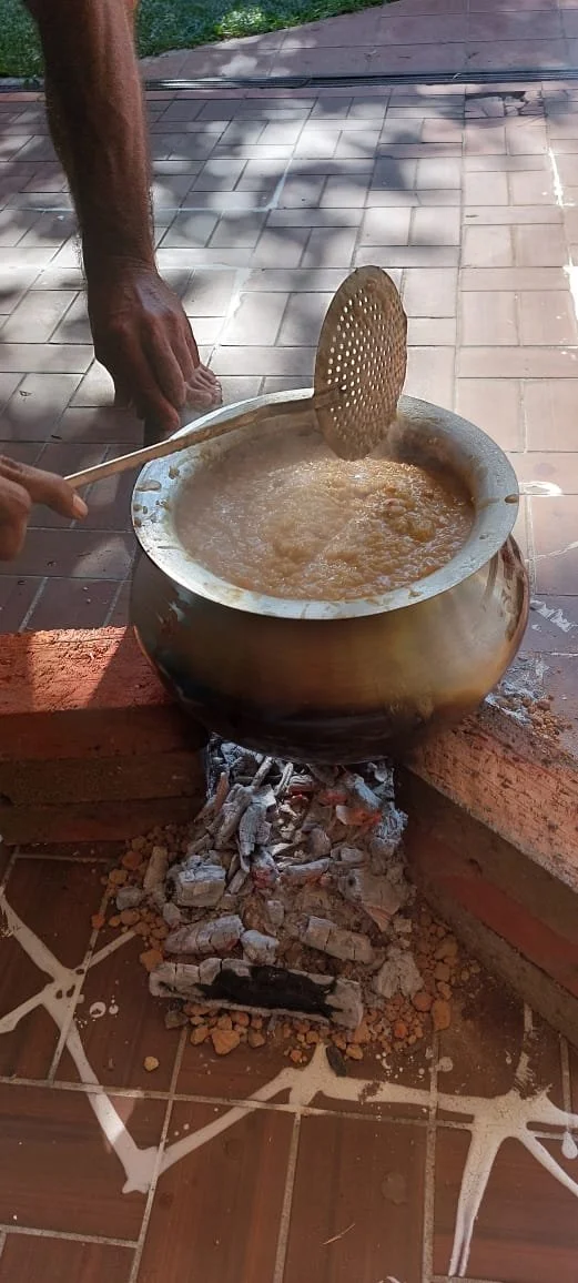 Then, the actual process of cooking the rice has its intricacies too. A large pot does not make for an easy cooking process especially when it is not done daily. And tasting as you go as one would do in normal cooking is not allowed as the first rice has to be offered to the Sun God, unadulterated! May sound silly, but remember, I was giving it my all. So, I used my other senses to gauge the doneness.