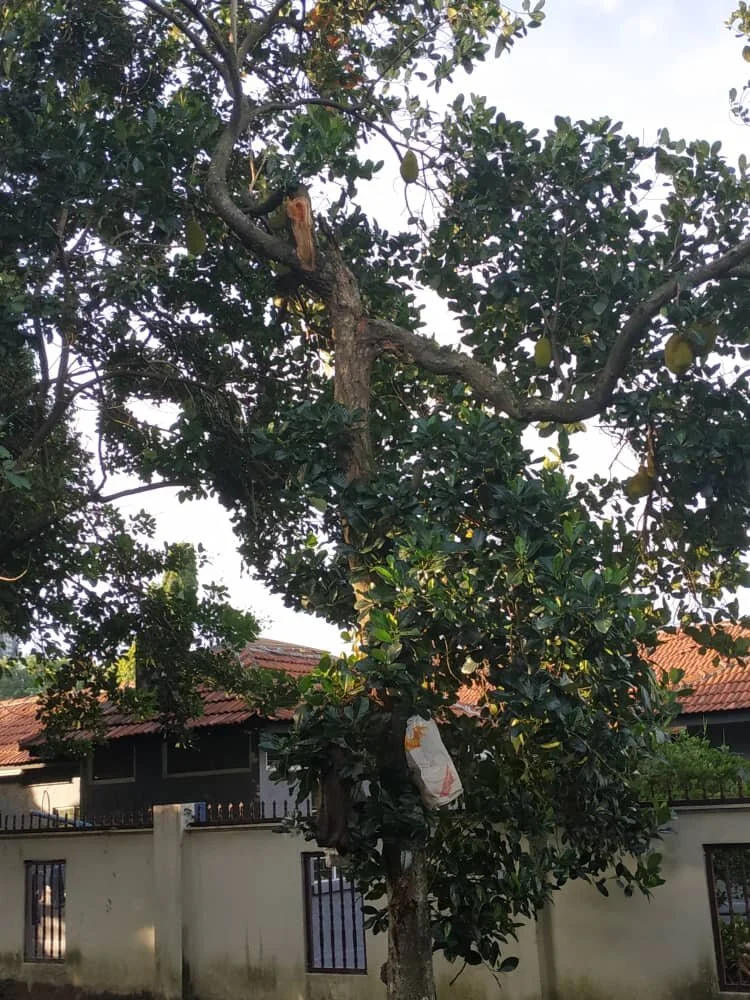 Upon loading the lorry, his two workers, who had spotted our jack fruit tree that was plump with fruits, asked if they could pick some fruits. I consented. As I pointed out where the ladders were, I noticed that one of them had already climbed the tree and was on the top of it. It is a tall tree, and I was amazed at how fast he had got to the top.